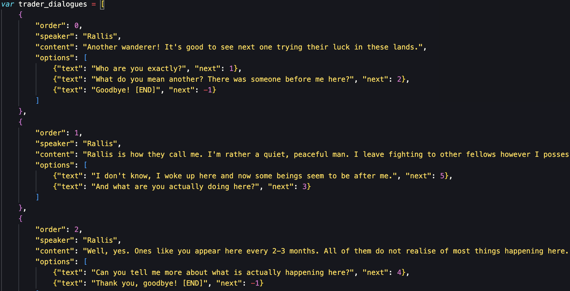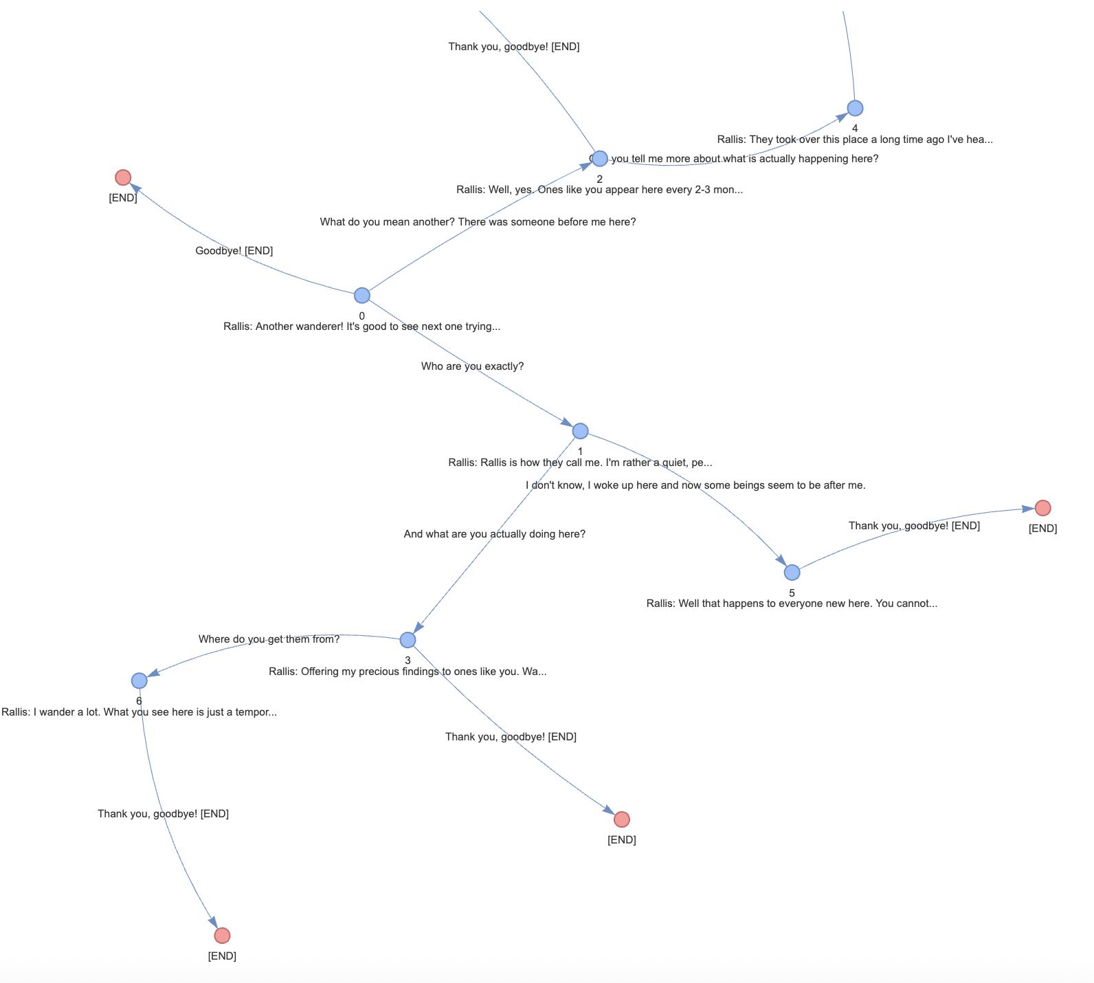 I write some dialogue lines into the singleton storage and define connections to the other lines (and thus the player response options). Then I run basic pyvis python program that creates a chart like that: